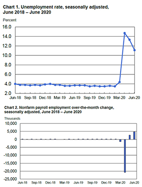 The BLS reported broad improvements in the labor market reflecting the continued resumption of economic activity that had been curtailed in March and April due to the coronavirus pandemic and efforts to contain it. In June, employment in leisure and hospitality rose sharply. Notable job gains also occurred in retail trade, education and health services, other services, manufacturing, and professional and business services.