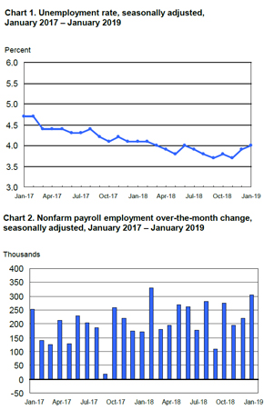 While this is slightly below the total of 312,000 originally reported for December 2018, the newest report revised that month’s gains down to 222,000 and brought November’s comparatively modest figure of 170,000 up to 190,000. Although the unemployment rate rose marginally between December and January – from 3.9 to 4 percent – this was attributed to a surge in the number of Americans actively looking for work, rather than any troublesome trend.